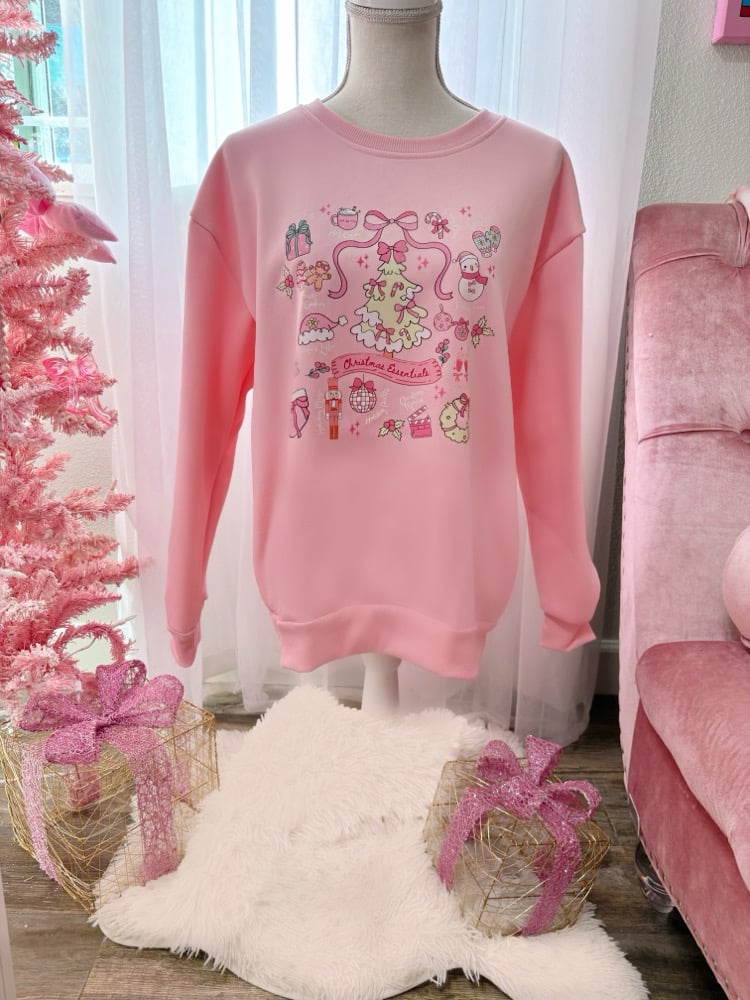 Get all the girly pink Christmas vibes with this adorable Christmas Essentials Sweater. This soft relaxed fit sweater features all the Christmas essentials in a cute print. This custom made sweater will get you ready to cozy up for the holiday season.