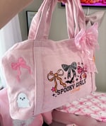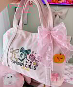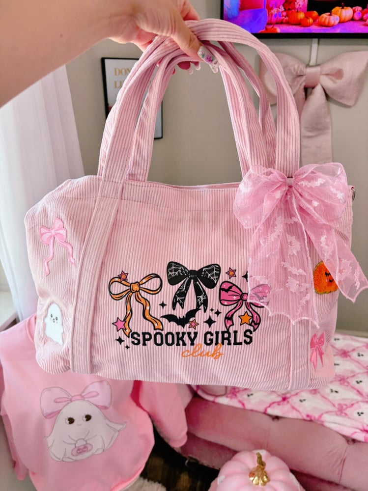 Get ready for spooky season in style with this adorable pink Halloween bag. Handmade one of a kind design on a beautiful pink corduroy bag. Featuring cute Halloween designs and a free Halloween bow that you can add to your purse. Double strap handles, cross body strap included, back pockets, and lots of space inside.